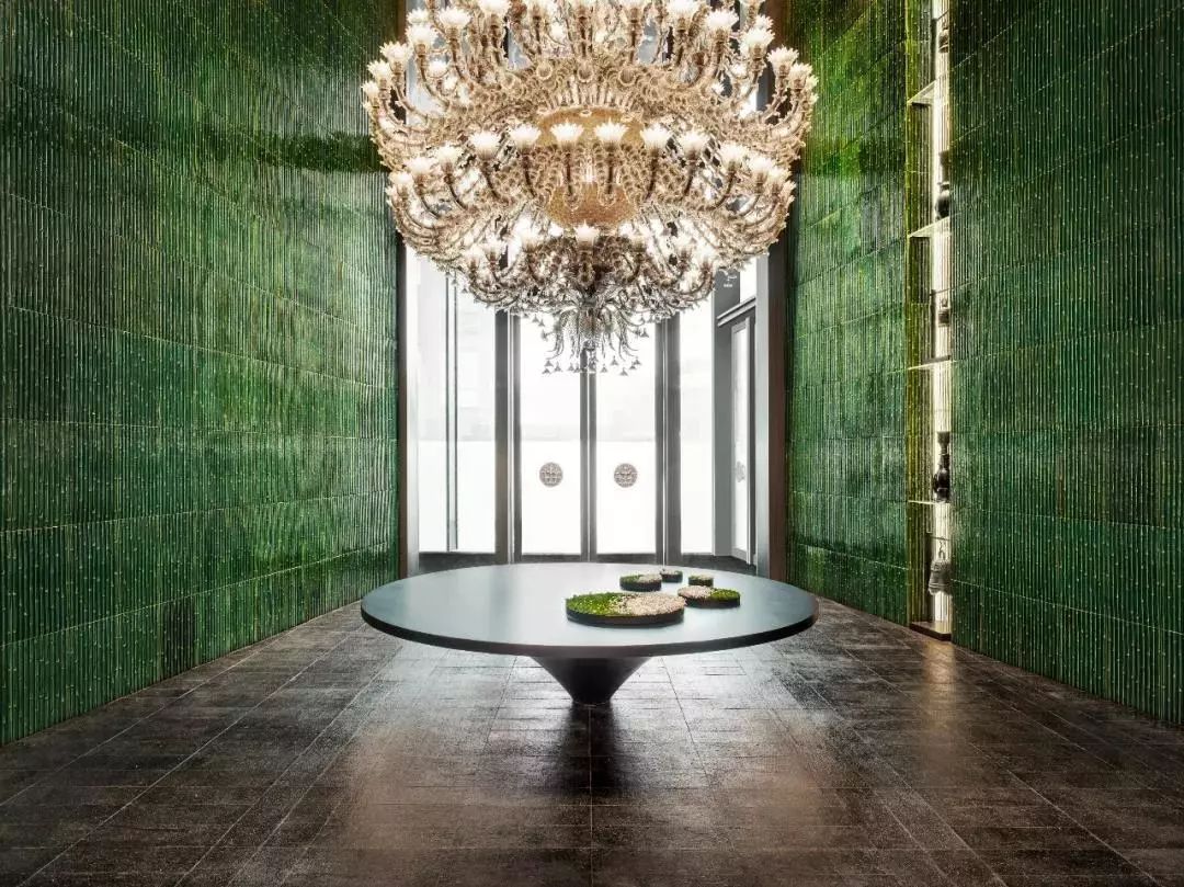 进门后首先映入眼帘的这个水晶灯就足够震撼,全部由纯手工穿制完成,背景这个绿绿的看起来像竹子的其实是瓷的材质。瓷算是镛舍的一大主要元素。