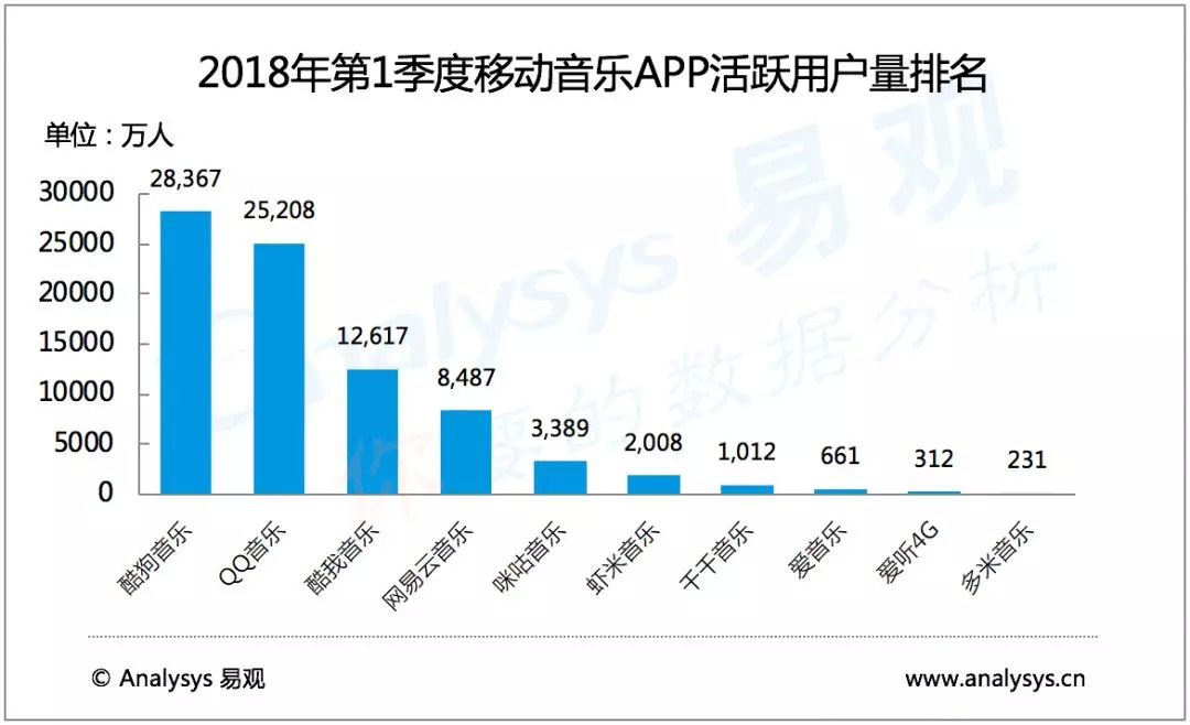 从2018年1季度的活跃用户数据来看,TME在音乐领域中的领先地位并没有因为版权互授举措的推行而动摇。腾讯音娱旗下酷狗音乐、QQ音乐、酷我音乐三大音乐平台的活跃用户量稳居市场前三位,其中酷狗音乐和QQ音乐有绝对的领先优势。