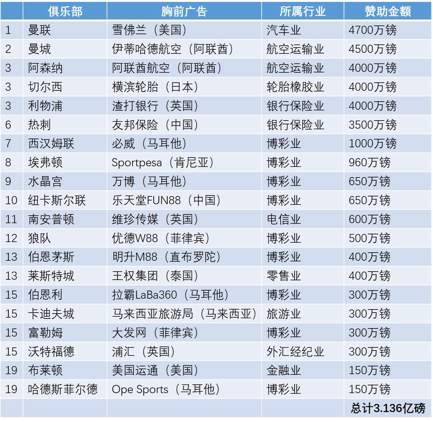 赞助总额的激增,主要得益于三大豪门曼城、利物浦、阿森纳更新了胸前广告合同: