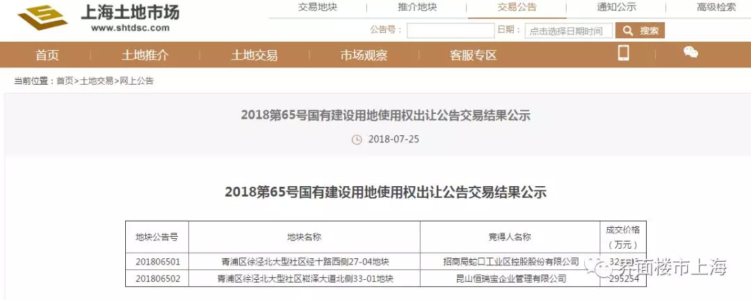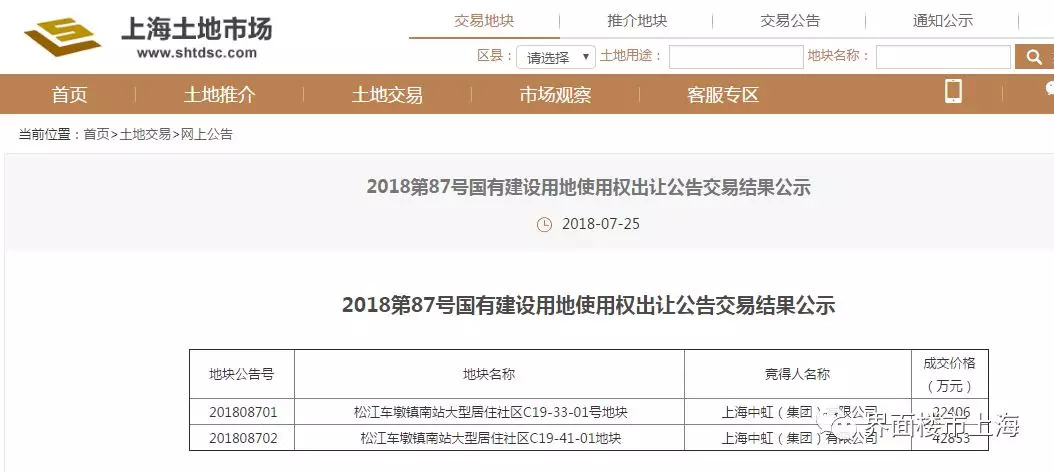 2018年7月23日,上海市土地交易市场举行了2场经营性国有建设用地使用权挂牌截止及现场竞价活动,交易结果如下: