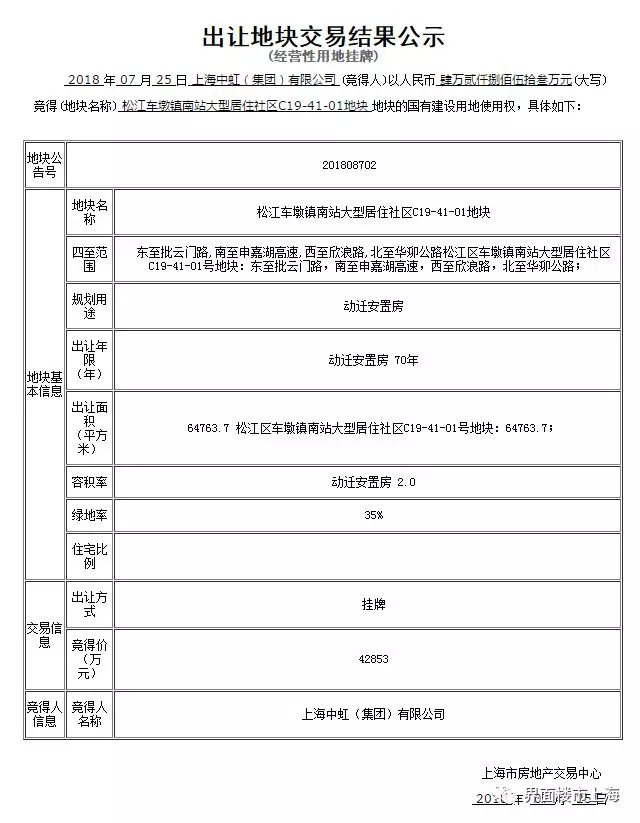 竞得人:上海中虹(集团)有限公司