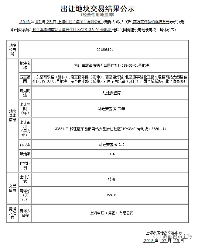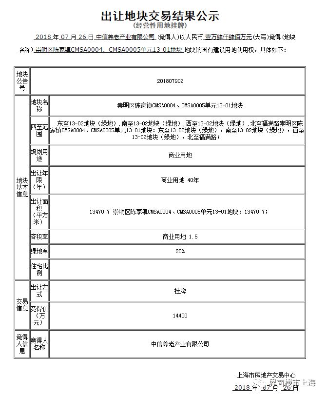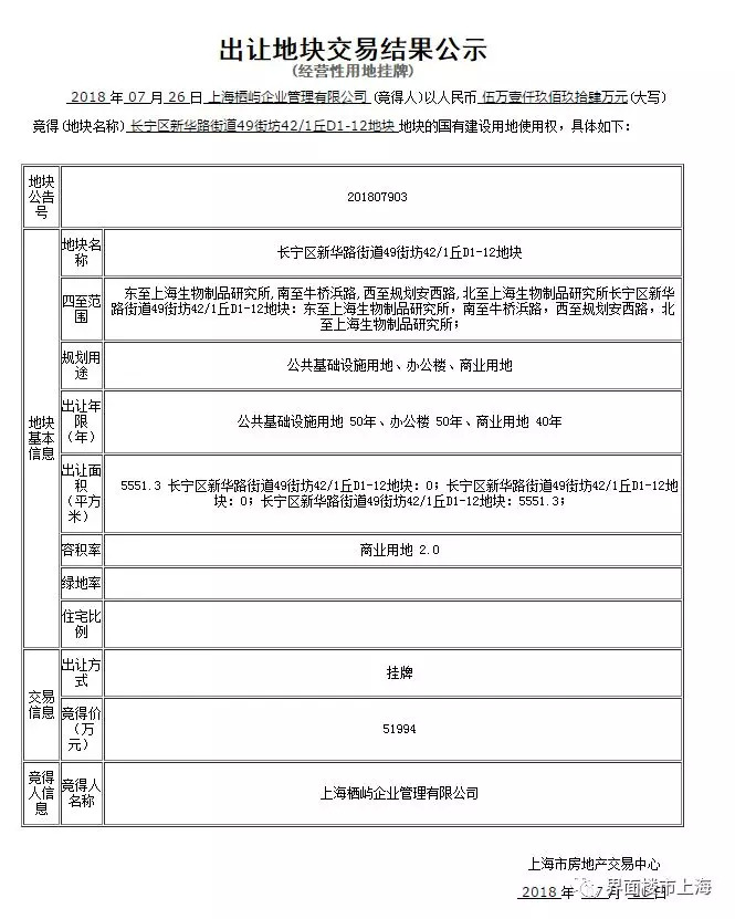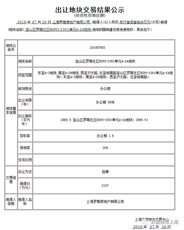 2018年7月24日,上海市土地交易市场举行了1场经营性国有建设用地使用权挂牌截止及现场竞价活动,交易结果如下: