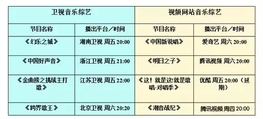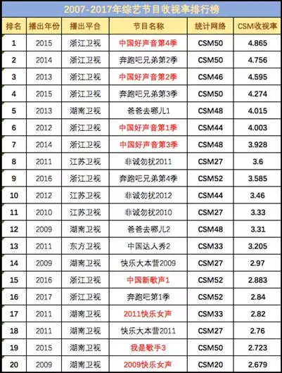 尽管,音乐类节目会有周期性起落,但该类型却从未消失过,一个重要原因就是能扛收视率,多少都能有一个保底成绩,而且也有制作经验可循,是相对安全的节目类型。从网上流传的07年至17年十年间的综艺收视排行统计来看,音乐类、相亲类、亲子类和真人秀是主要的胜出类型,其中中国好声音系列、快乐女声、我是歌手都位列收视排行前20。