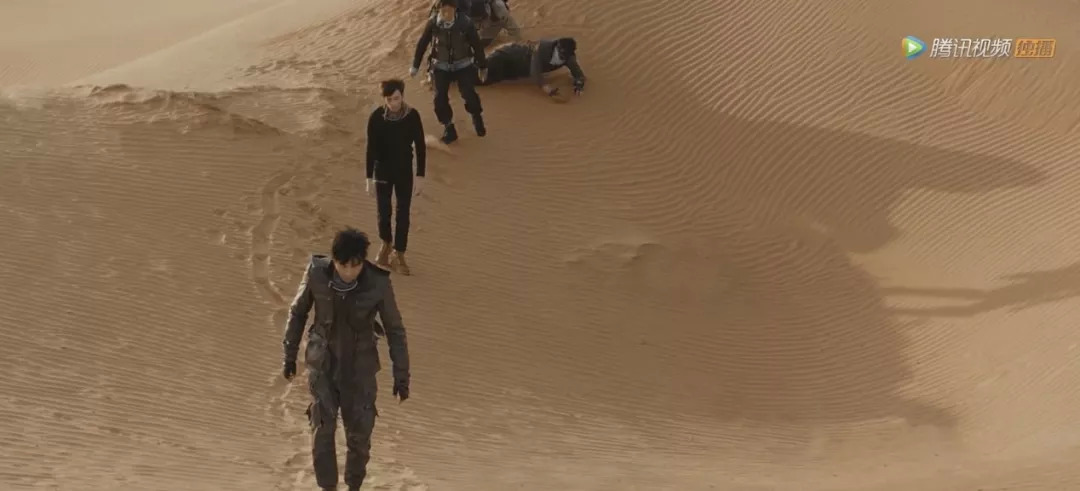 这个场景和《沙海》剧集中的片段不谋而合。吴邪和一行人在寻找古潼京的途中迷失了方向,缺水加上长途跋涉后所有人都感到坚持不下去了,可他还在最前头,领着大家一直向前走。这个场景最能体现秦昊对于吴邪的理解。