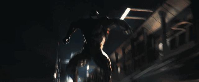 在预告片中,毒液拥有黑色肌体包裹高大威猛的身型,摧枯拉朽的力量。近乎楼高的壮硕身型远观如同一只黑色巨兽。