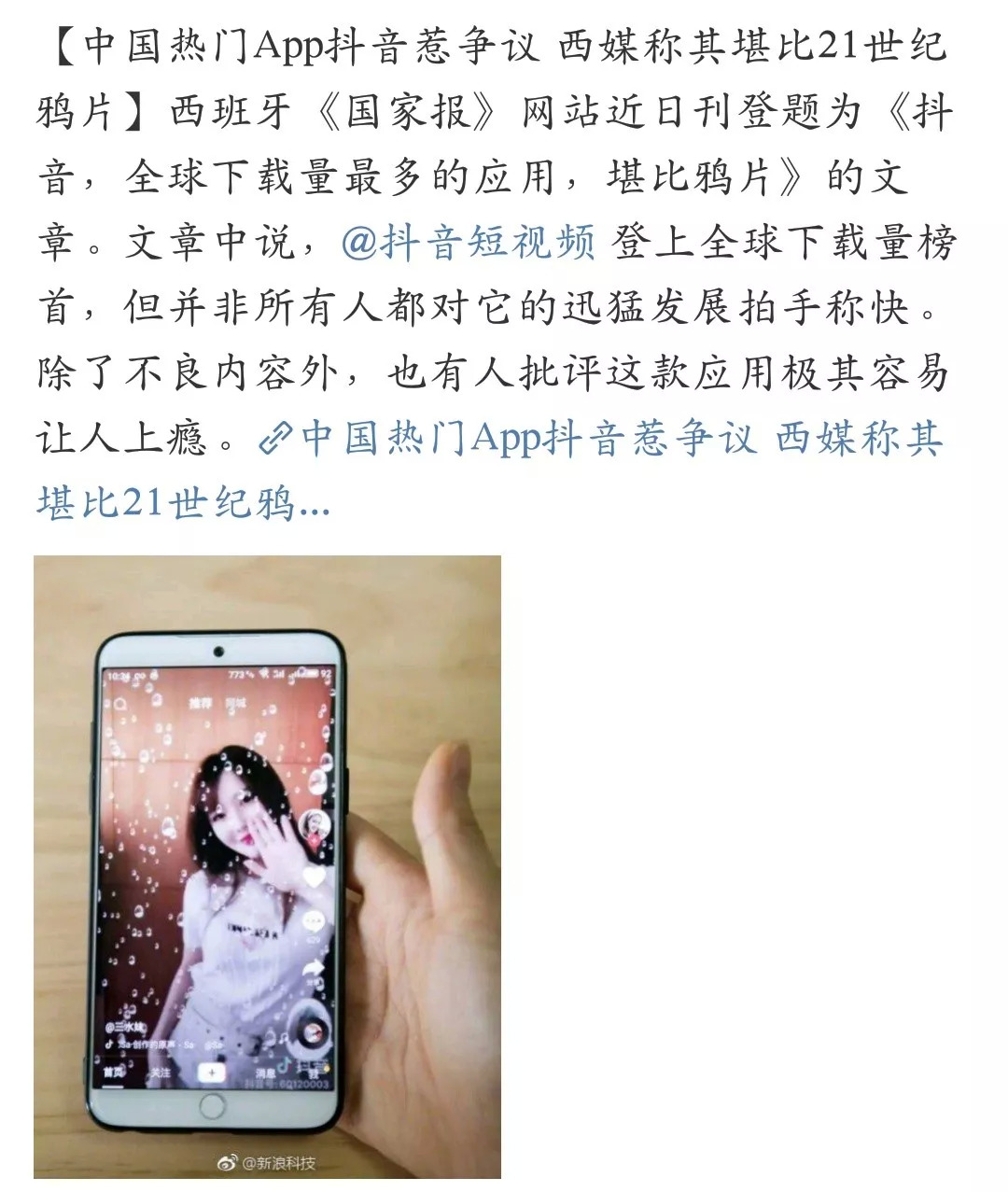 近日,西班牙《国家报》网站刊登题为《抖音,全球下载量最多的应用,堪比鸦片》的文章。