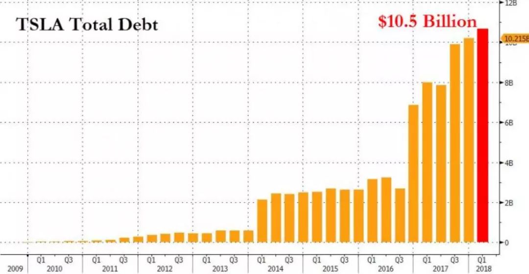 亏损似乎是整个新能源汽车行业目前需要面临的问题。曾经风光无限的特斯拉如今现金流已经连续5个季度为负。最近三年,只有在2016年第三季度现金流为正的4.24亿美元,目前接近负15亿美元。因此,特斯拉的负债不断叠加。目前债务达到105亿美元,大约相当于特斯拉总市值的五分之一。