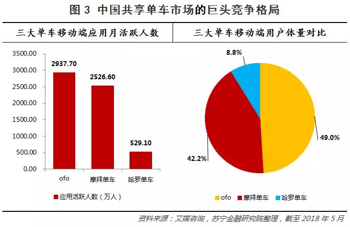 (二)巨头林立,一时难分高下。据艾媒咨询统计,截至2018年6月,中国共享单车市场共存着三大巨头:ofo、摩拜单车、哈罗单车。2018年5月,ofo以2937.7万的移动端应用月度活跃人数领跑市场,紧随其后的摩拜单车拥有2526.6万月活,而哈罗单车与前两者的差距较大,仅达到529.1万月活(参见图3)。共享单车市场“两强争霸”的格局明朗,不过,秉持“农村包围城市”道路的哈罗单车,以完全的免押金、较优的车辆质量、良好的骑行体验等卖点,快速逆袭,大有成为第三极巨头之势。综合来看,共享单车市场巨头间竞争激烈,“烧钱游戏”远未结束,便宜的单车还能再骑很长一段时间。