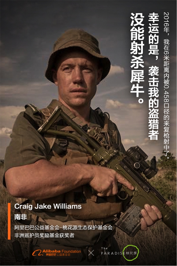为了阻止盗猎者射杀犀牛,来自南非克鲁格国家公园的巡护员Craig Jake Williams曾在6米距离内被0.458口径的来复枪射中。在领奖时,这位铮铮铁汉眼睛湿润了:“当巡护员不是一件容易的事,漫漫长夜我们要睡在丛林里,早上要起的很早,日复一日地追踪偷猎者,最后得到很少的报酬。我们需要像马云先生这样的支持和关注,他让我们知道,很多人都在关注我们,我们并不孤单。”