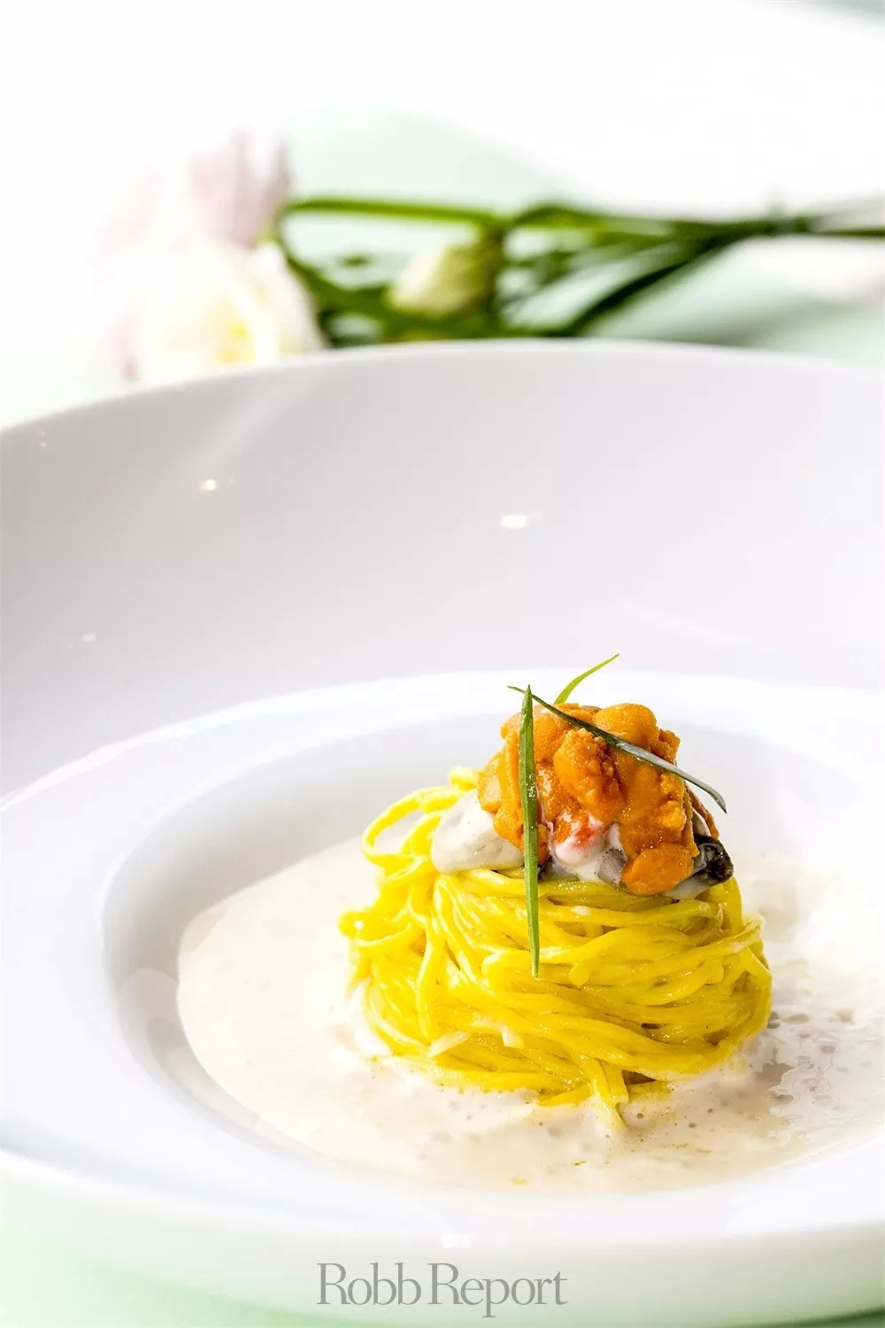 需要特别推荐的菜品当然是“南瓜意面、生蚝泡沫、海胆”,这道菜中,南瓜意面由餐厅纯手工制作,非常新鲜有嚼劲。黄油和生蚝被打成泡沫作为酱汁围绕在意面周围,意面顶端点缀以新鲜海胆以及生蚝。搅拌均匀后便能感受到酱汁的浓郁鲜香,以及海胆和生蚝厚重鲜美的口感,让人无比回味。