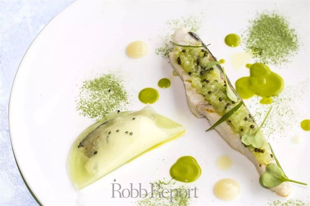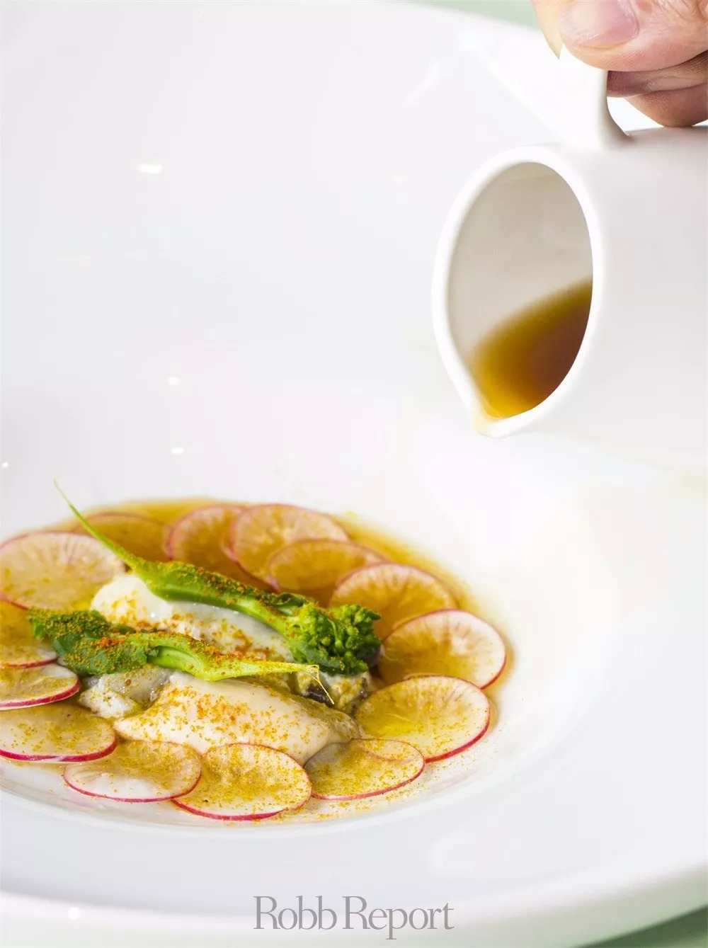 当然“蒸生蚝、红萝卜、烟熏鸡肉清汤”这道菜的多重鲜美口感也非常值得推荐,三黄鸡和清远鸡经四小时熬制出的鸡汤搭配蒸制而成的法国布列塔尼生蚝,入口便可感受到多重鲜香体验。 主菜“煎琥珀鱼、黄瓜、俄罗斯鲟鱼子酱、生蚝”是一道集视觉与味觉的绝佳菜品,黄瓜绿色系清新搭配加上这道菜中肥美的生蚝,芬芳中回味无限。