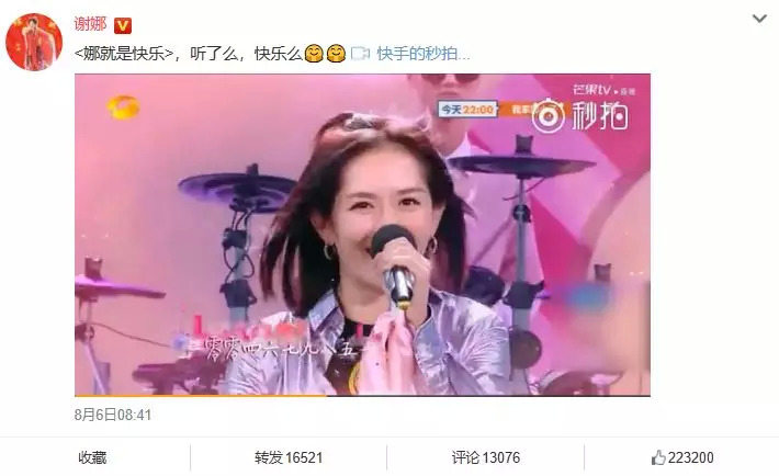 8月4日晚,谢娜在《快乐大本营》首唱新曲《娜就是快乐》,并透露了自己与这首歌的机缘—— 在“快手音乐人”活动专区里发现了音乐人“雪无影Jennifer”的歌,还在歌词中暗藏玄机地写了一串数字1004679851,就是自己的快手ID。