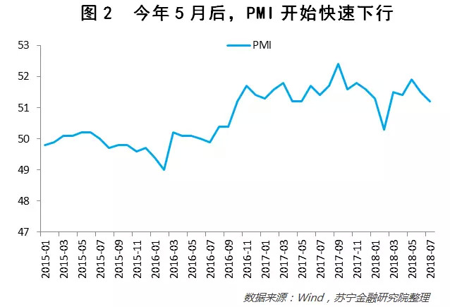 从经济增长看,去杠杆大致可以分成两个阶段。第一个阶段是政府一刀切停止平台和房地产的融资供给;第二个阶段是经济主体主动收缩融资需求。目前经济已经进入阶段二,对应经济增速会逐步下滑。从PMI指标看,目前经济正在快速掉头向下(参见图2)。