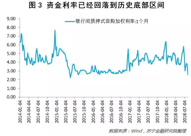 为对冲经济下行压力,央妈再次放水,银行间资金利率快速下行。由于央妈今年三次进行定向降准,同时7月23日进行5020亿MLF投放,银行间资金面极度宽松。目前1个月质押式回购利率下行到2.6%,已经回到上一轮宽松周期的水平。在上一轮宽松周期中,2015年年中至2016年年底资金利率维持低位,1个月银行间质押式回购利率在2.3%-3.6%区间内波动。目前资金利率已经重回历史底部区域(参见图3)。