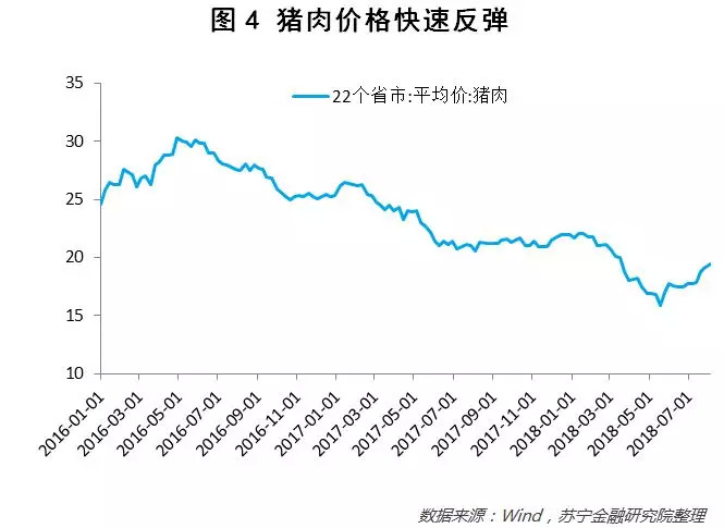 另外,虽然经济有下行压力,但通胀却有上行风险。具体来说,人民币贬值、环保检查和猪肉疫情将加大下半年通胀压力。目前离岸人民币汇率已经快速贬值到1美元兑换6.85人民币的水平,人民币大幅贬值会带来输入性通胀。环保检查以及今年采暖季限产50%,使得近期大宗商品价格出现新一轮暴涨,焦炭价格在过去不到一个月时间里上涨了25%左右。高温天气和猪肉疫情,也加大了食品价格涨幅,今年主产区小麦累计收购3696.7万吨、同比减少1836万吨,苹果期货上市后价格已经翻番,猪肉价格在5月中旬以来已经上涨23%(参见图4)。