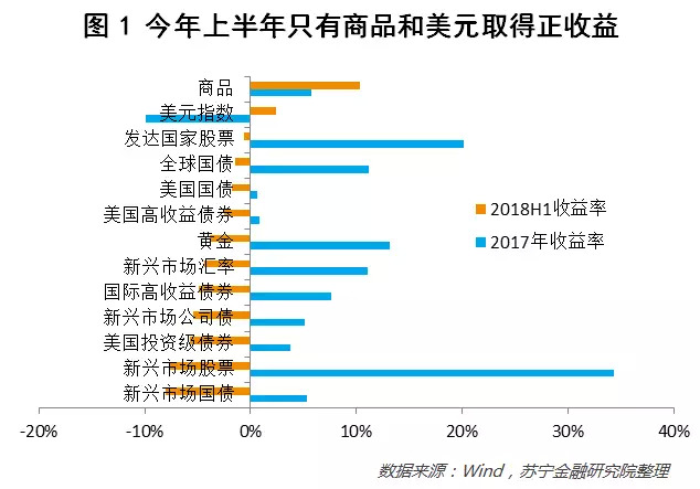 然而,2018年全球环境彻底改变,强势美元成为全球资产定价的锚。经济走弱、强势美元以及贸易战,新兴市场股票拐头向下,黄金也在美元不断上涨的环境下节节下跌。今年,全球资产中只有两类资产取得正收益:一是商品,石油是各类商品中最晚上涨的品种,这一轮周期也是如此;二是美元指数,今年上半年美元指数已经上涨2.45%(参见图1)。如果今年要评选全球资产价格之锚的话,非美元莫属。