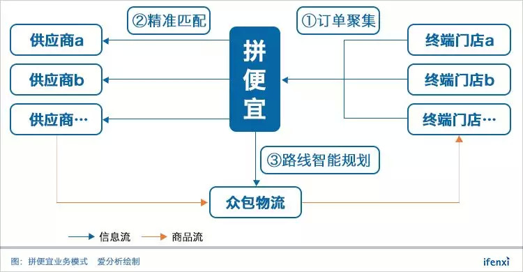 终端门店首先在APP内发起采购需求,拼便宜将一定区域内的门店采购需求进行拼单,形成一个大的采购订单。拼便宜通过大数据和算法,将集合的订单分配至不同供应商处,以获取最优的采购价格。