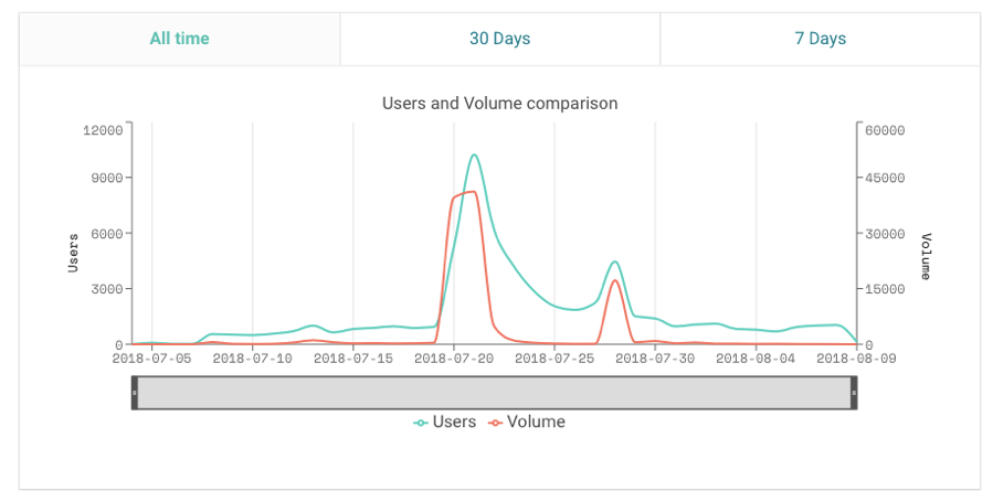 根据DappRadar数据显示,Fomo3D在7月20日当天24小时内用户量暴涨近500%,交易量更是翻了100倍,从410个ETH直冲近4万个ETH。在游戏类DApp用户活跃榜中排名第一。
