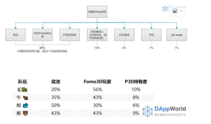 Fomo3D的游戏设计同样遵循“负和博弈”原则。用户购买key的资金,只有一部分用来投入奖池作为奖金,另一部分被用作邀请分红、P3D持有分红和空投等方式分发出去。另外还有2%被用作社区基金的收益。