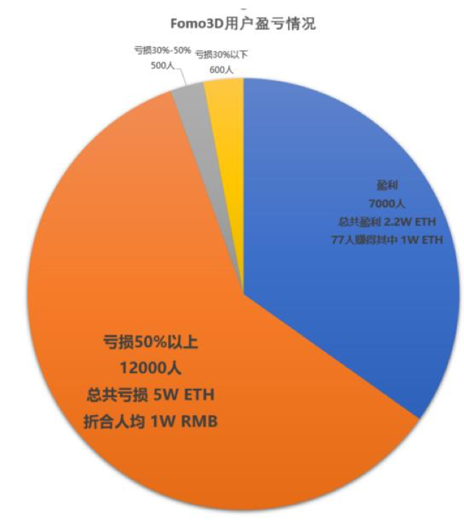 DappWorld提供的数据显示Fomo3D近20000用户里面,有13000人亏损,一共赔了 6万个ETH,人均亏损4.6ETH(折合人民币11300多元)。其中腰斩50%以上的有大约12000人,一共亏了5万多个ETH,。亏损达30-50%的有500人,亏损30%以内的有600多人。