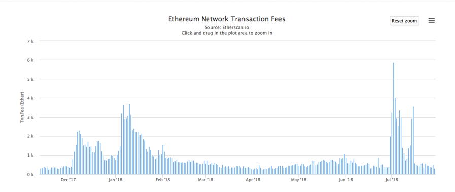 Fomo3D的疯狂甚至造成了以太坊网络的拥堵。7月中下旬,在Fomo3D用户大量涌入的时间段,以太坊待确认的交易数达到了近7万笔。交易费用也随之拔高,超越了今年1、2月份因为以太猫游戏火爆而造成的高手续费价格。
