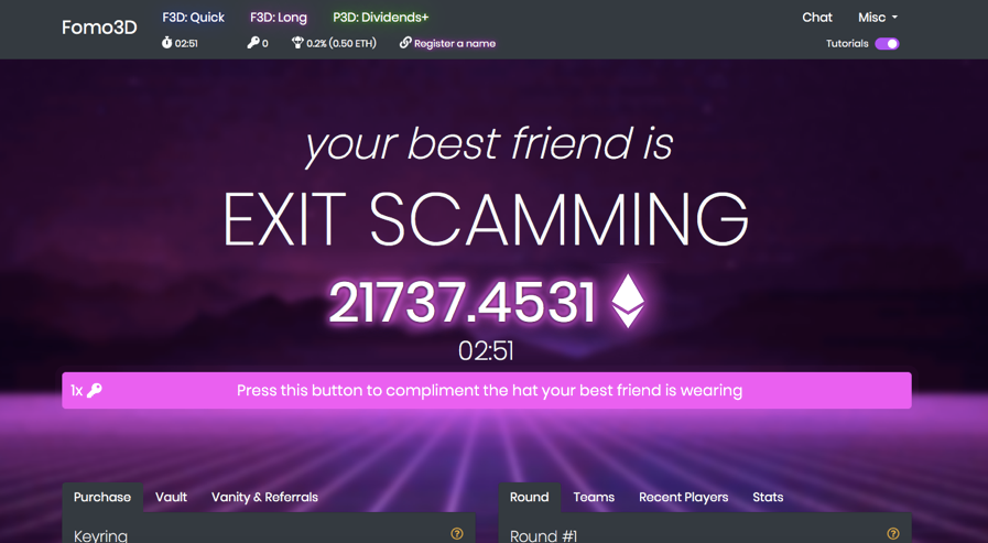 游戏名字FOMO的意思即为“担心错过恐惧症”(fear of missing out)。Fomo3D的官网地址更是一个再明显不过的提醒:http://exitscam.me(逃脱骗局的我)。