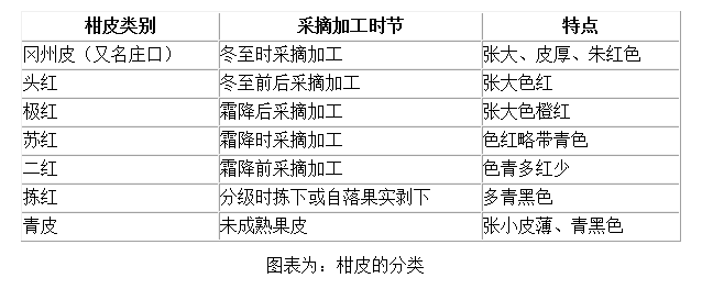根据广州陈皮历史规格来看,其史上将柑皮分为冈州皮(又名庄口)、头红、极红、苏红、二红、拣红、青皮等。其特点参见下表: