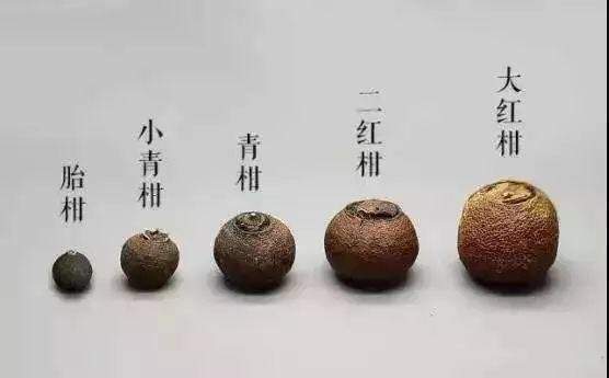 就流通于茶叶消费市场上柑普茶,目前主要有柑胎、小青柑、青柑、二红柑、大红柑,其依据主要根据柑皮的成熟程度来分。具体如下: