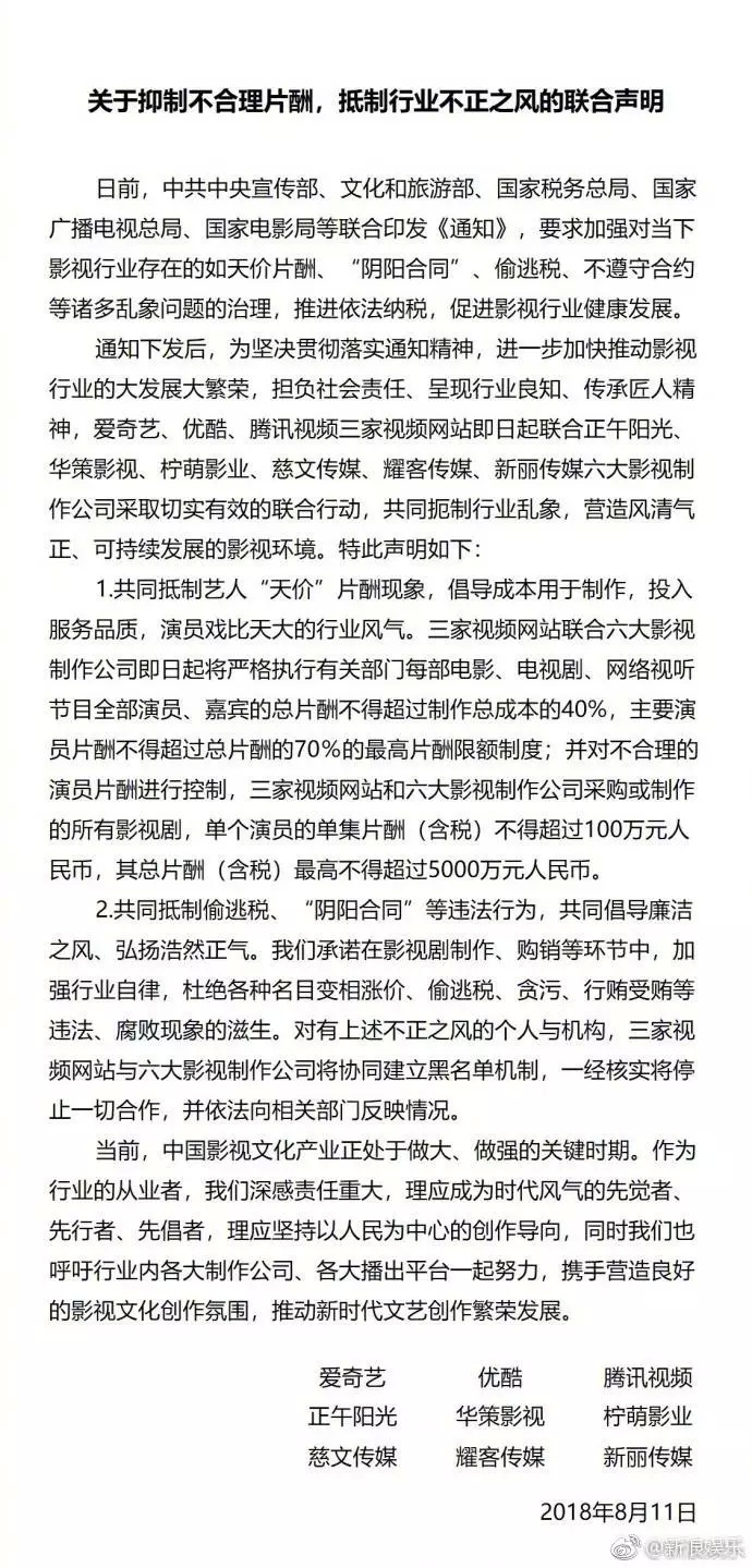 8月11日上午九点,优爱腾三大视频网站联合六大制片公司共同抵制“天价片酬”,其中单集片酬(含税)不超过100万元、总片酬(含税)不超过5000万元成了人们关注的焦点。