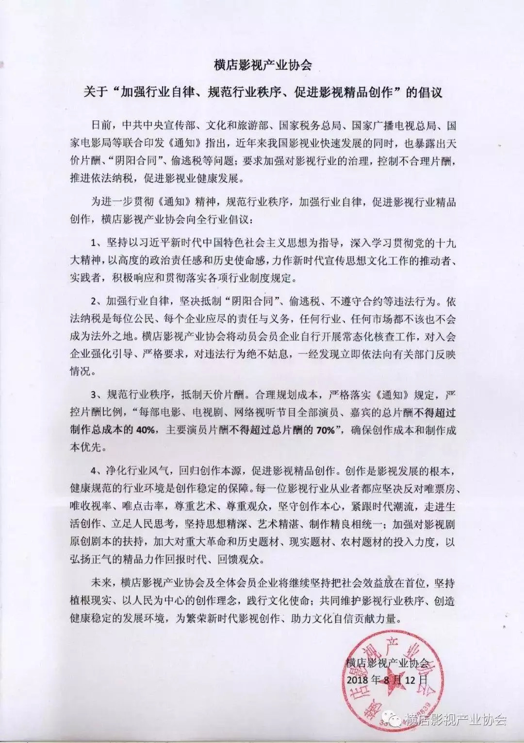 昨天,以华谊兄弟为会长单位,汇集了博纳影视、横店影视、乐视花儿影视、唐德影视等400余家影视企业的横店影视产业协会也发表了《关于“加强行业自律、规范行业秩序、促进影视精品创作”的倡议》。