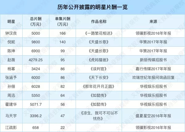 为此文娱商业观察翻阅近几年影视类上市公司的公开材料,包括公告、年报、招股说明书等,将散落在边边角角的明星收入信息汇总,分别制作成明星片酬情况、明星年收入情况和影视公司经纪收入三张表格,以管窥豹,试图反映整个行业的状况。