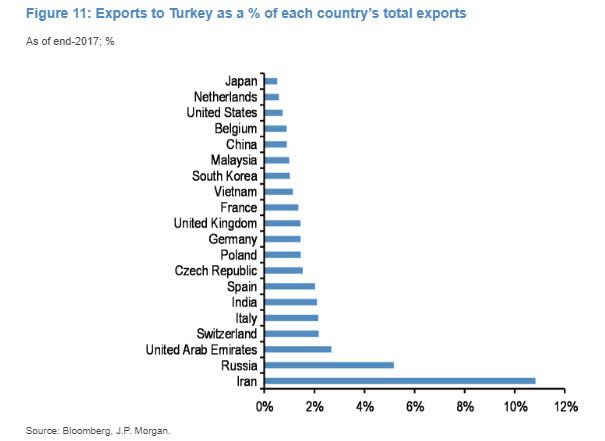 摩根大通整理了土耳其主要的贸易伙伴,根据相关数据,土耳其最大的5个出口国是中国、德国、俄罗斯、美国和意大利,加总约占总量的40%。