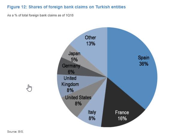 摩根大通总结认为,就外国银行敞口而言,西班牙,法国和意大利银行以及通过或有风险暴露的美国和英国银行似乎最容易受到土耳其的影响。