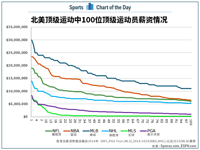 再来看足球和高尔夫。前五名球员的薪资或者说奖金MLS(美国职业足球联盟)和PGA(美国职业高尔夫联盟)旗鼓相当,几乎持平,不过足球的薪资曲线末尾收于8.7万美元,这使得它和高尔夫2400万美元的薪资看起来差距着实不小。