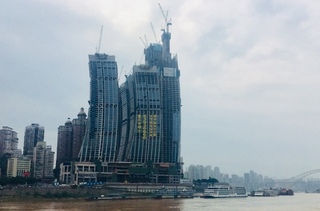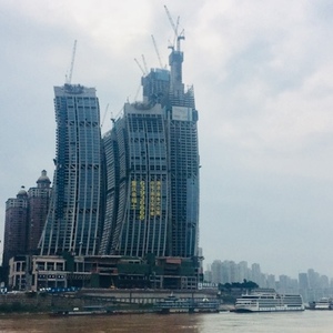 从江对岸眺望来福士,几座高层塔楼已建成封顶。建筑工地上仍在忙碌着。根据重庆当地媒体报道,位于朝天门上空250米处的来福士的空中水晶连廊也已于7月7日正式合龙。