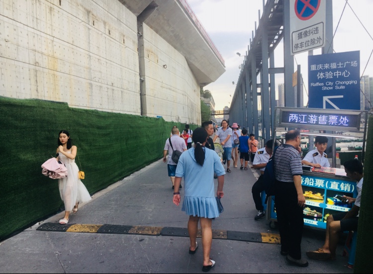 因为被建筑工地所阻,要到来福士广场前端的朝天门广场,则要沿江边道路到码头之后,再沿石阶爬上去。而在人们涌入朝天门之后,都是停留在码头的两江岸边,能有兴趣再上到广场的并不多。