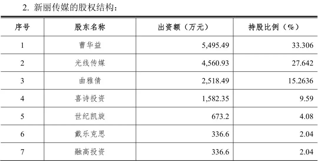 在光线出售新丽股份前, 光线是新丽第二大股东。此外,还有马化腾持股54.29%的世纪凯旋、万达影视、联想等实力不俗的大牌企业股东,更有明星张嘉译(本名张小童)、胡军、宋佳 、苏芒等明星直接持股,还有通过喜诗投资间接持股的多位明星。