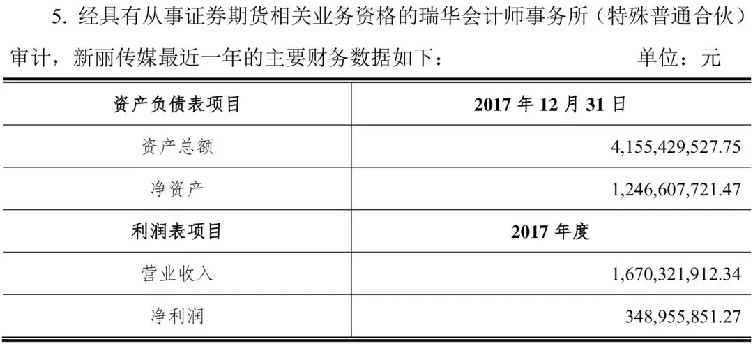公告显示,新丽传媒2017年营业收入16.7亿,净利润3.49亿,静态市盈率(PE)为34.39倍。