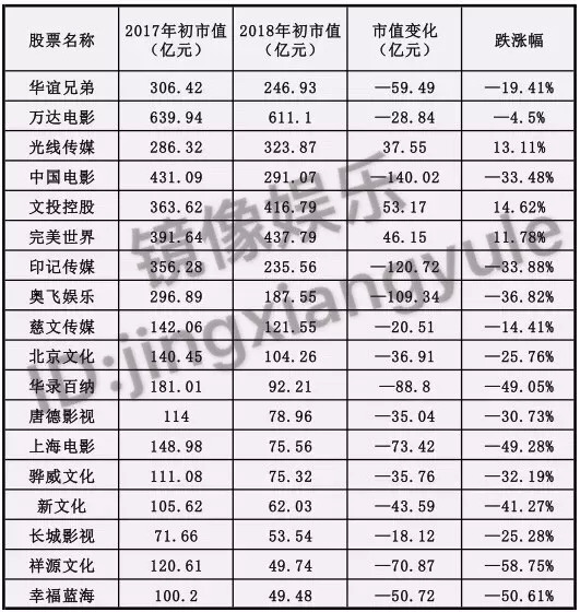 从2017年初和2018年初的市值,除了光线传媒、印纪传媒与完美世界3家公司市值小幅增长外,其余15家影视公司去年一年市值共蒸发了932.15亿元,近1000亿元,跌幅在30%以上的高达11家。