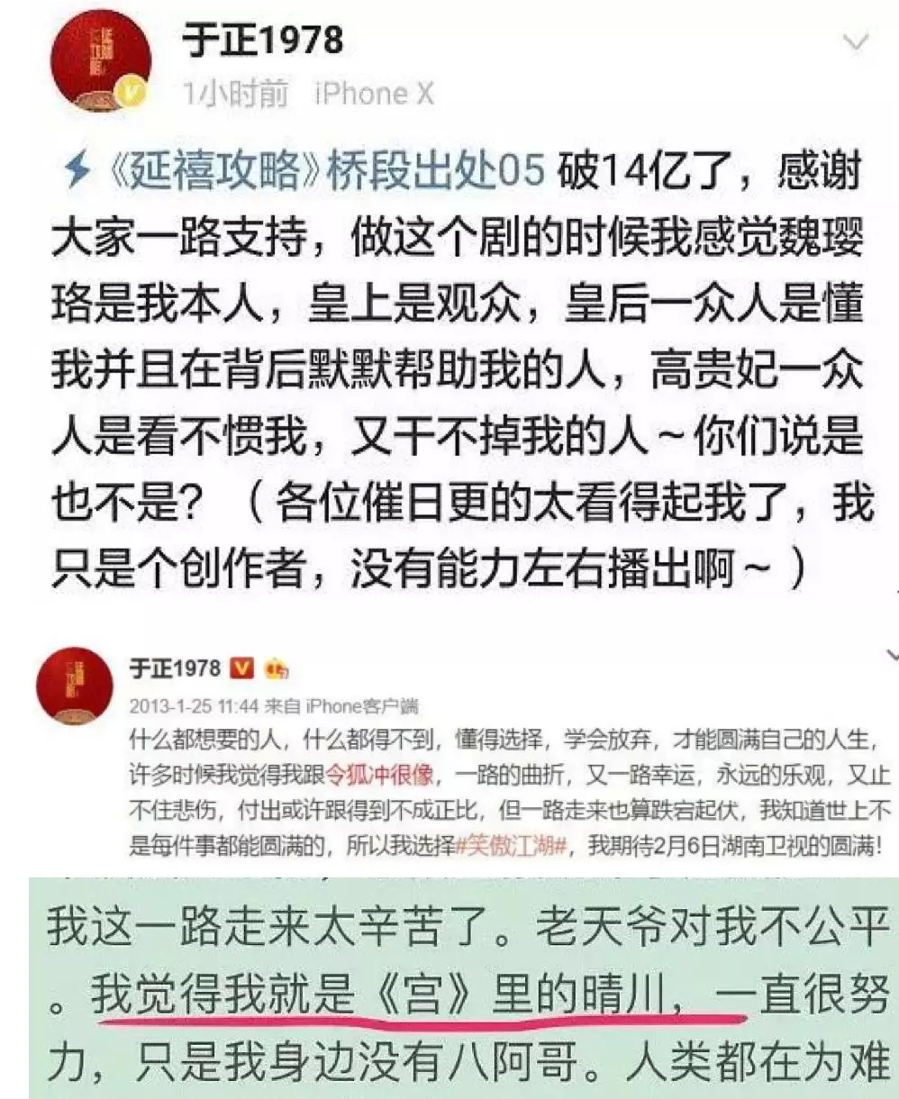 把握“爽”感,本质需要创作者的共情。代入自己怎么爽怎么来,才算人剑合一。你看于正老师,做《延禧攻略》觉得自己像魏璎珞,做《笑傲江湖》觉得自己似令狐冲,做《宫锁心玉》就自比晴川,这完全是自己在开挂爽玩的节奏啊。