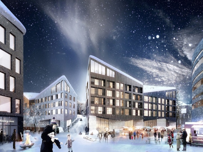 根据公布的方案,Kjellander + Sjöberg为基律纳镇中心设计了一个总面积达2000平方米,拥有90间公寓的住宅社区。整片社区的住宅楼不规则地排列在一起,而住宅楼本身也都被设计成了不规则的形状。Kjellander + Sjöberg表示,这是为了整个社区能够更好地经受住极地狂风暴雪的考验——这些刻意为之的“不规则”能让房屋在积雪承重以及抵抗大风上有更好的表现。