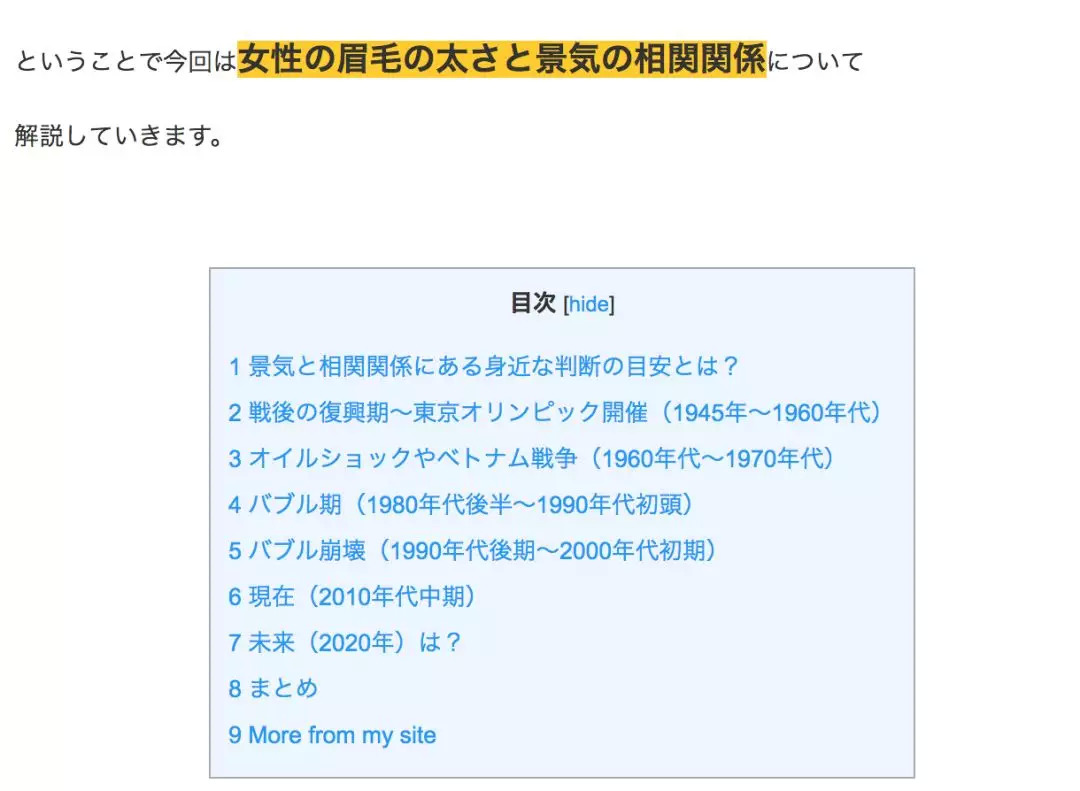 日本近年流行起来一种“眉毛经济学”。当不景气的时候,女性之间就会流行“细眉”,反之则流行“粗眉”,即经济状况与女性眉毛的粗细成正比。这一理论获得了一些国内外学者和资生堂等化妆品牌的认可。