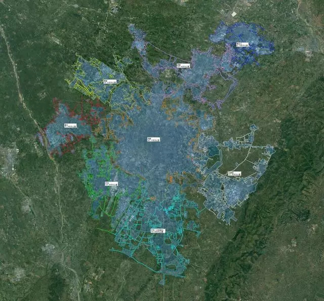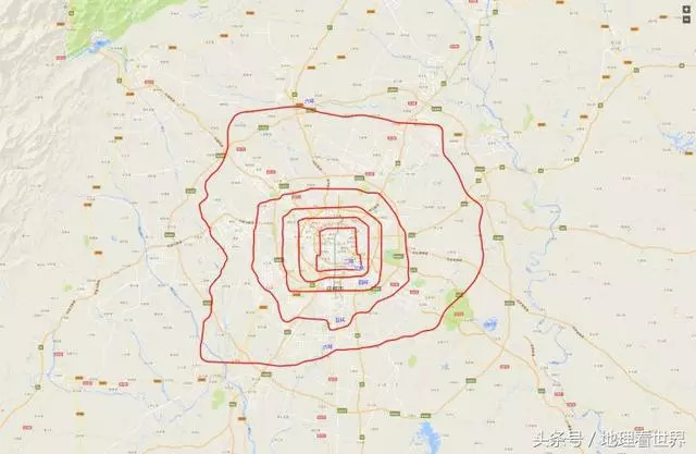 同比例的北京放在四川盆地。你会发现北京六环几乎和成都重叠。成都的城市扩张路线和北京很像,都是一环一环的摊大饼似的。成都的绕城高速几乎与北京五环重叠,而成都的第二绕城高速则与北京六环几近套圈。难怪有网友对成都的建成区面积进行了实测,结果显示为1090平方公里,和北京已然相差不大。