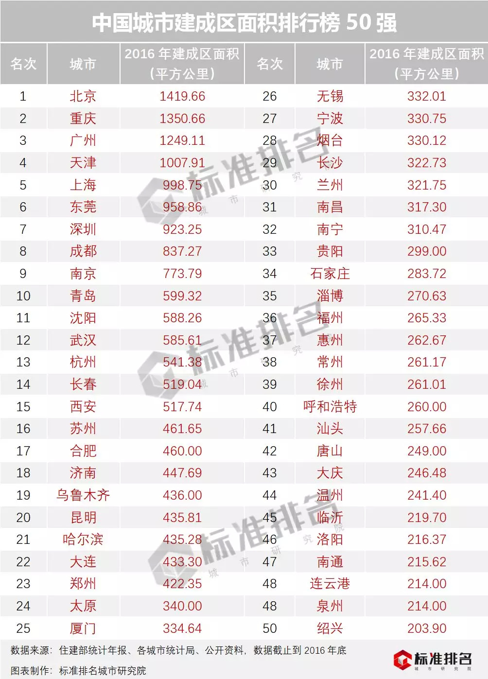 由于数据是截止到2016年底的,部分城市可能出现现实的偏差。比如青岛,2016年的数据是599.32平方公里,但由于下辖县级市撤市设区,被新算入城市建成区面积的范畴,数据变化相对较大,最新的数据显示,青岛的建成区面积已经达到638.4平方公里。