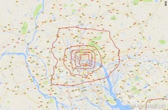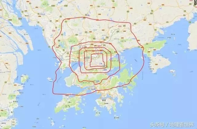 同比例的北京放在珠三角的中段。你会发现北京六环完全覆盖了深圳大部分和香港一半。深港经济一体化谈了很久,但深港城市的一体化不太现实,毕竟深圳主城区和香港主城区中间隔了了大半个新界,这里几乎是香港未开发的区域。