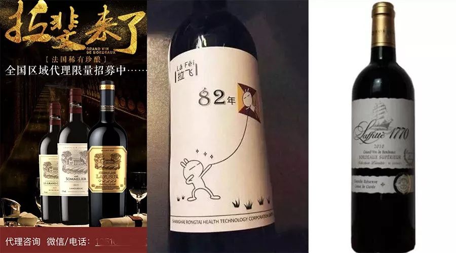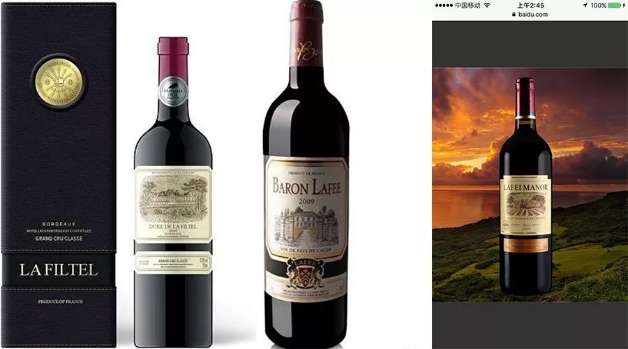 最后,以一组各种擦边拉菲和拉菲家族酒的图片结尾,特别留意里面的五支箭的形状差异,及外文名称中某些字母的差异。