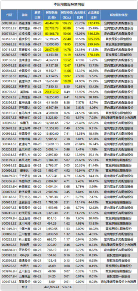 据Wind数据统计显示,8月20日-8月24日共有50家公司限售股陆续解禁,合计解禁量44.70亿股,以8月17日收盘价计算(下同),解禁市值为539.14亿元。