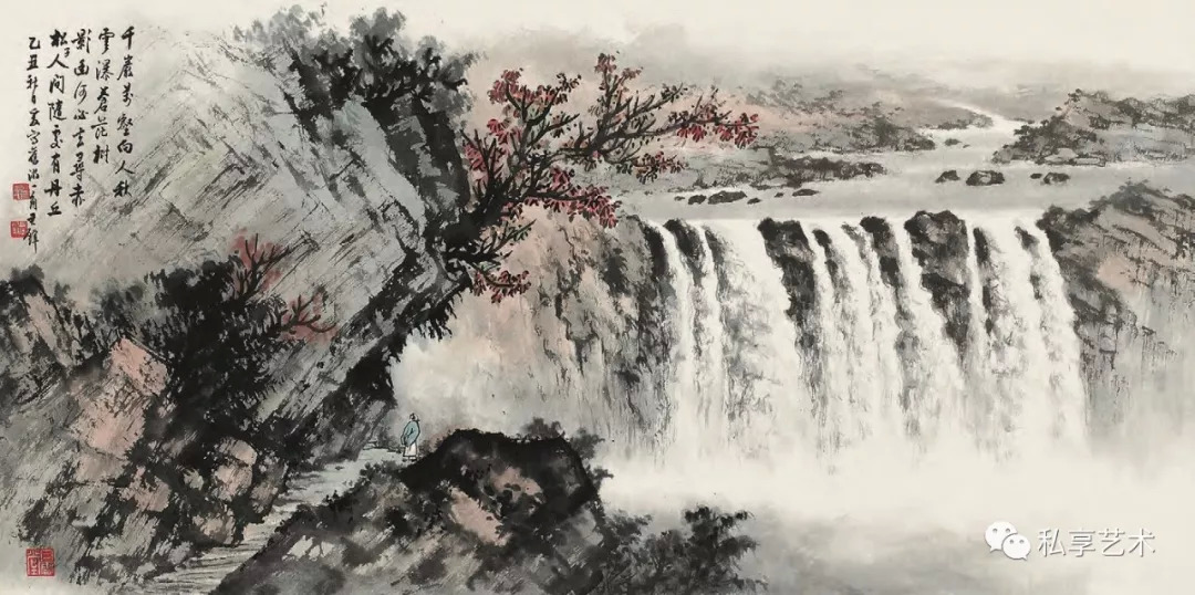 黄君璧先生将中国传统瀑布画法中的垂直的细长,变为世界三大瀑布所显现的阔的景象,而直接表现为画的直幅与横幅的不同。中国传统水墨画中的直幅通常是以为表现的主体,直立能够突出山的雄伟,那山中的瀑布就只能是细长。而横幅是以表现 瀑布为主,能够呈现像世界三大瀑布那样宽 阔的气势。这也是传统山水画表现中的「高远」与「平远」的不同。这种因为写山与 写水在表现对象主体上的差异,所带来的画 面幅式上的不同是决定画面构图的根本。
