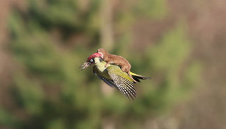 3月3日左右,一张黄鼠狼宝宝趴在飞翔的啄木鸟身上的照片悄然走红网络: