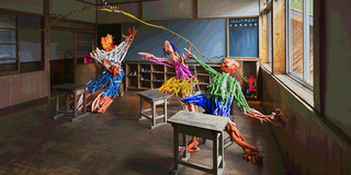 于是,参观者可以看到用漂流木捆扎而成的人形,以飞翔姿势悬停在体育馆半空、以奔跑状态出现在走廊、以四肢全都伸展开来的样子把教室衬得拥挤不堪,三个小学生有时出现在课桌椅上、有时破门而出、甚至有一半直接飞进墙壁、另一半从学校背面的窗户冲了出去。